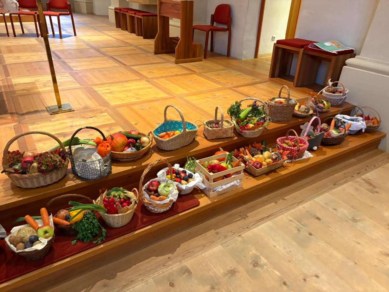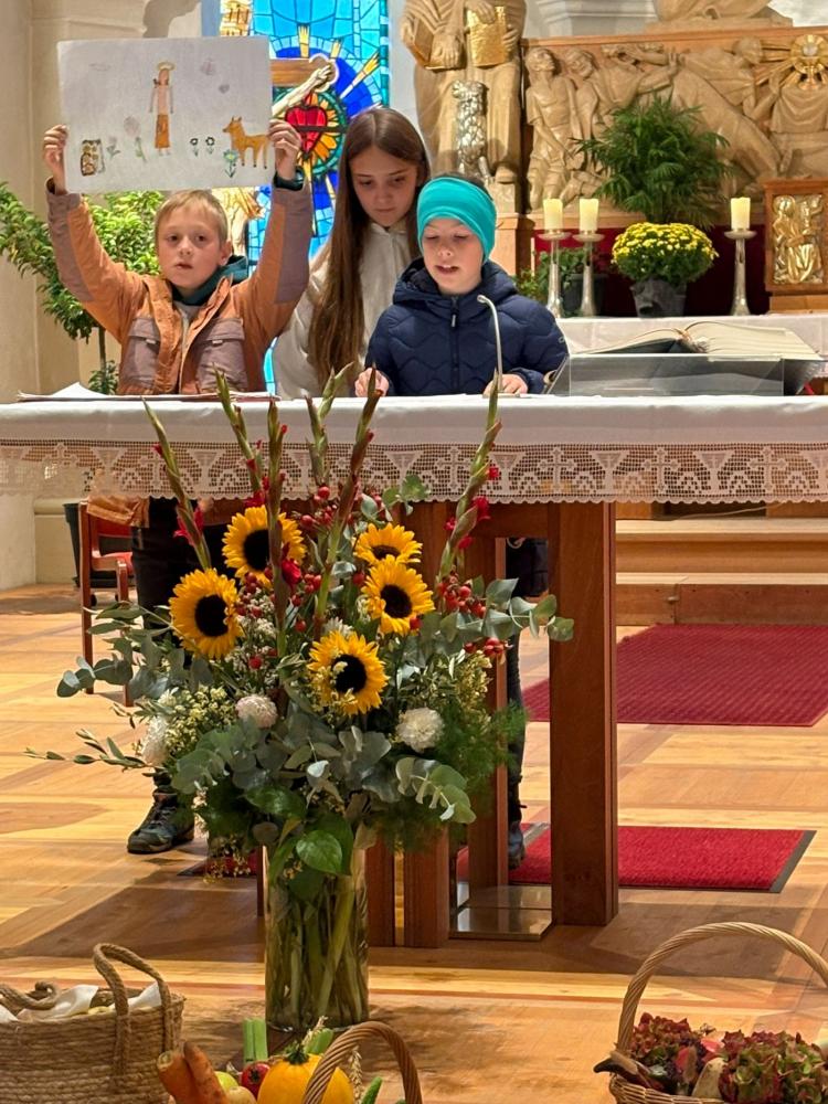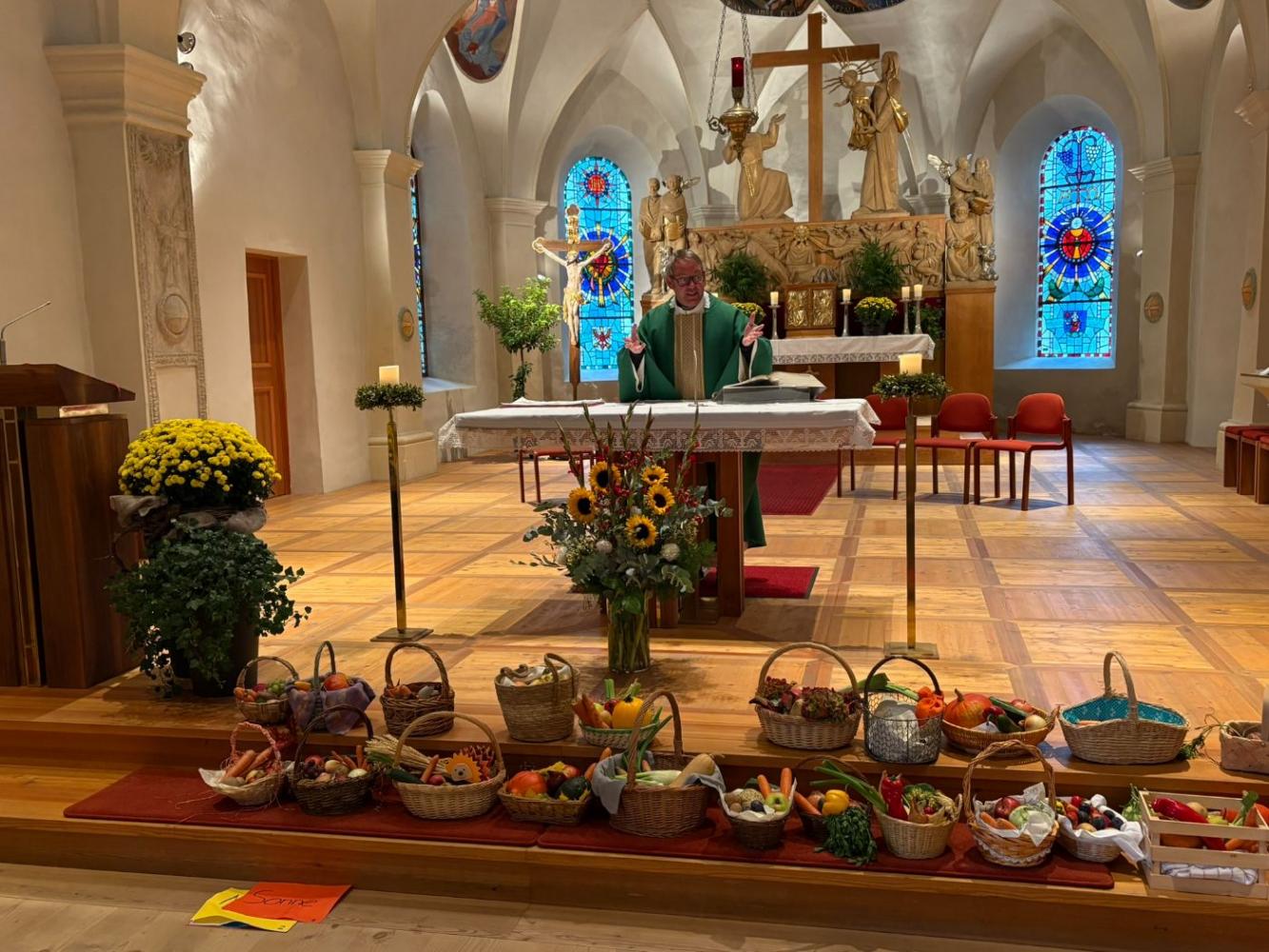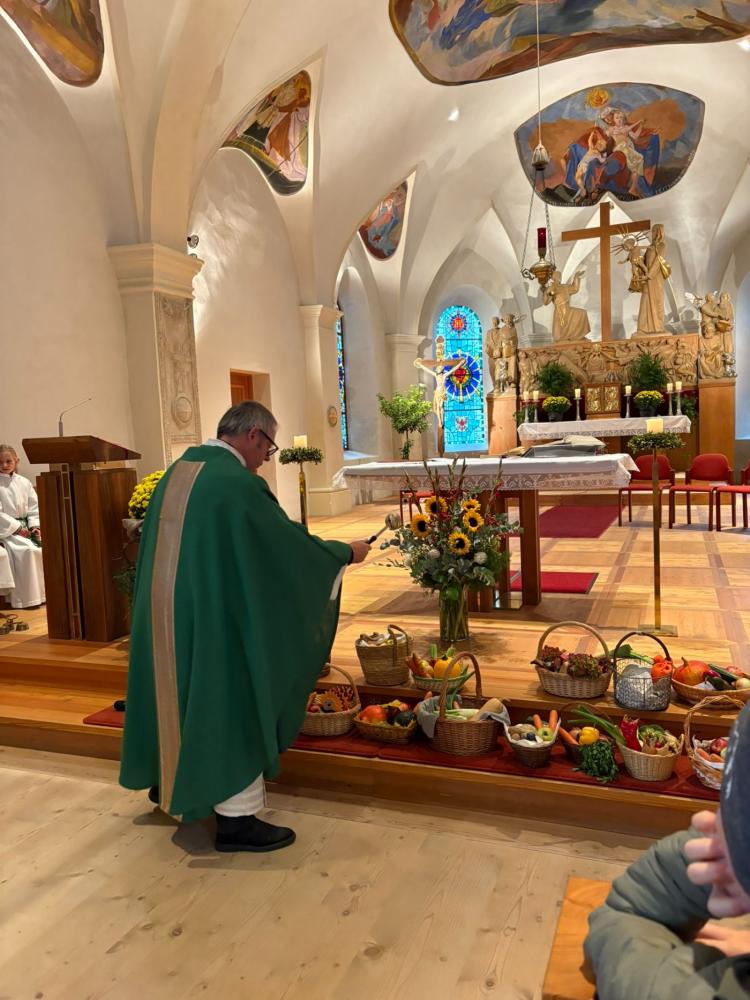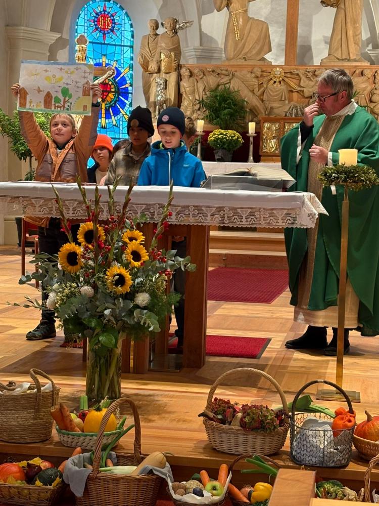 Es wurde für die Freunde, die Familie, die Tiere, das Wasser und vieles mehr gedankt. Die Erntekörbe der Kinder dekorierten die Kirche auch dieses Jahr wieder in bunten Farben. Die Messe wurde musikalisch vom Schülerchor gestaltet.