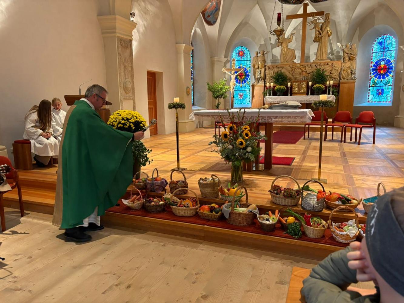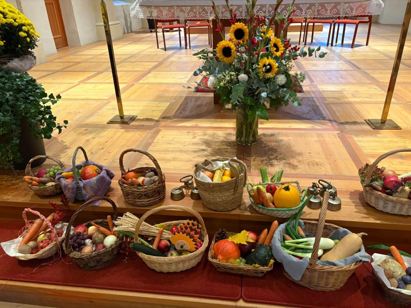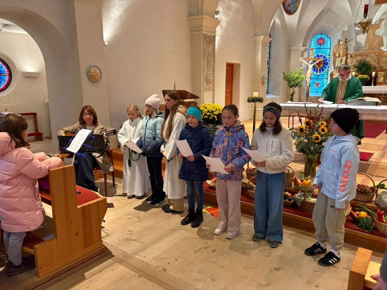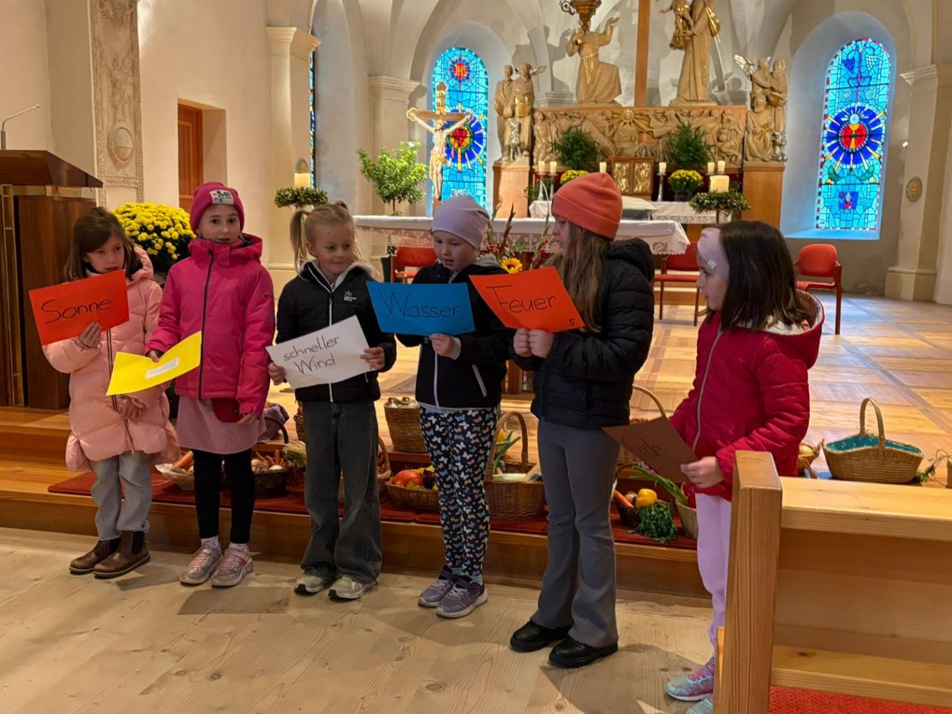 Es wurde für die Freunde, die Familie, die Tiere, das Wasser und vieles mehr gedankt. Die Erntekörbe der Kinder dekorierten die Kirche auch dieses Jahr wieder in bunten Farben. Die Messe wurde musikalisch vom Schülerchor gestaltet.