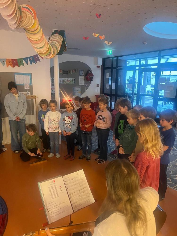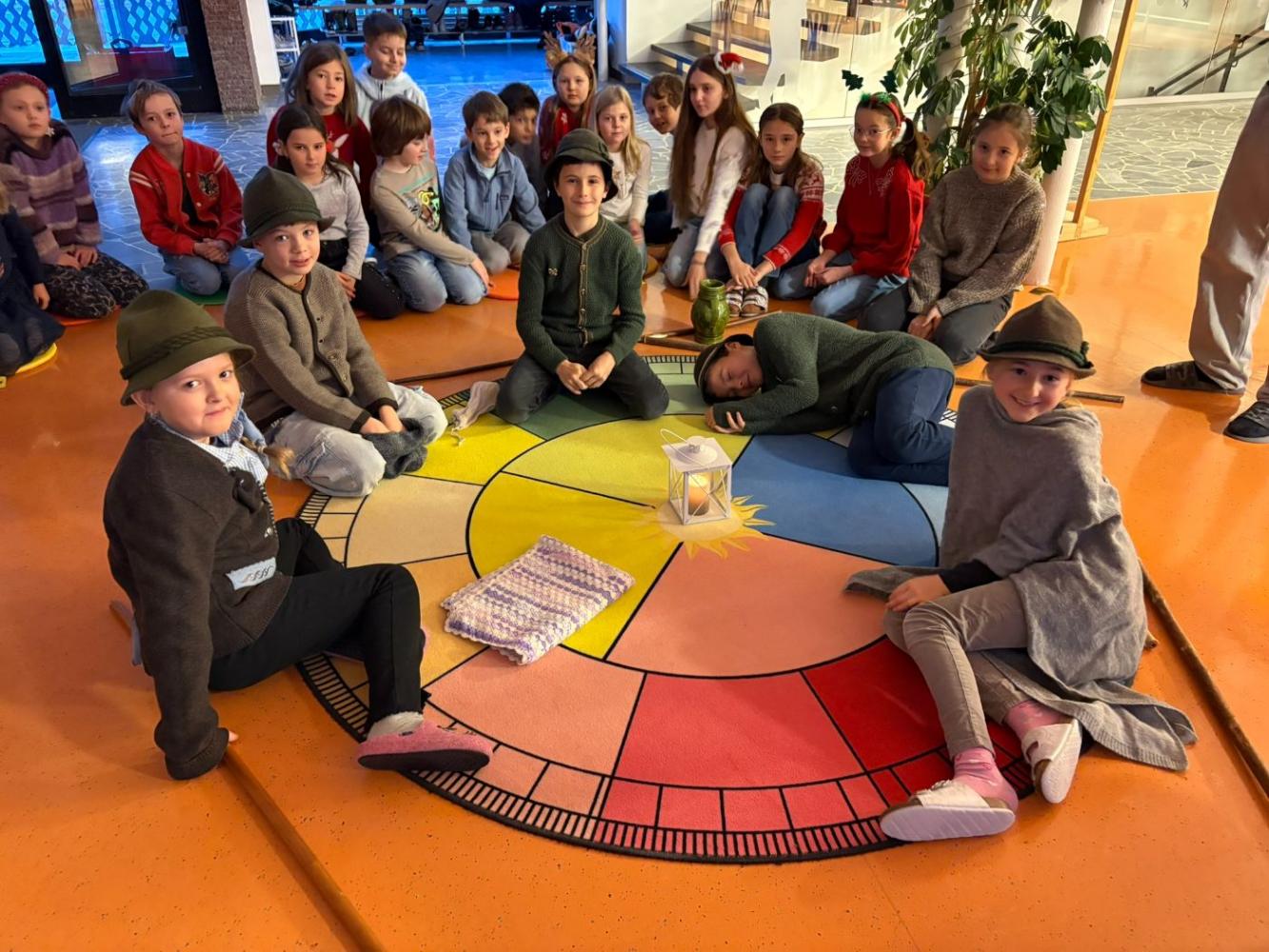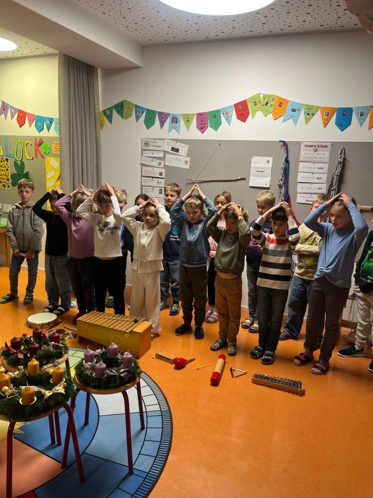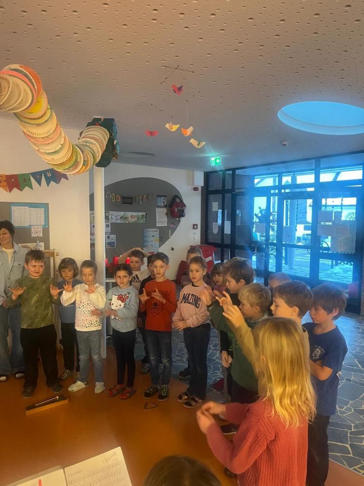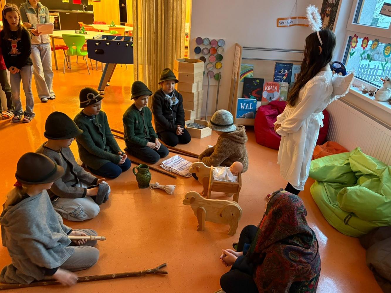 Jeden Montag kam eine andere Klasse dran und führte den MitschülerInnen und Lehrerinnen etwas vor. Nachdem die 1., 2. und 4. Schulstufe eine Nikolaus-Klanggeschichte, einen Weihnachtswünsche-Rap, Gedichte vorgetragen und Weihnachtslieder gesungen hatten, führte die 3. Schulstufe noch ein Krippenspiel vor.