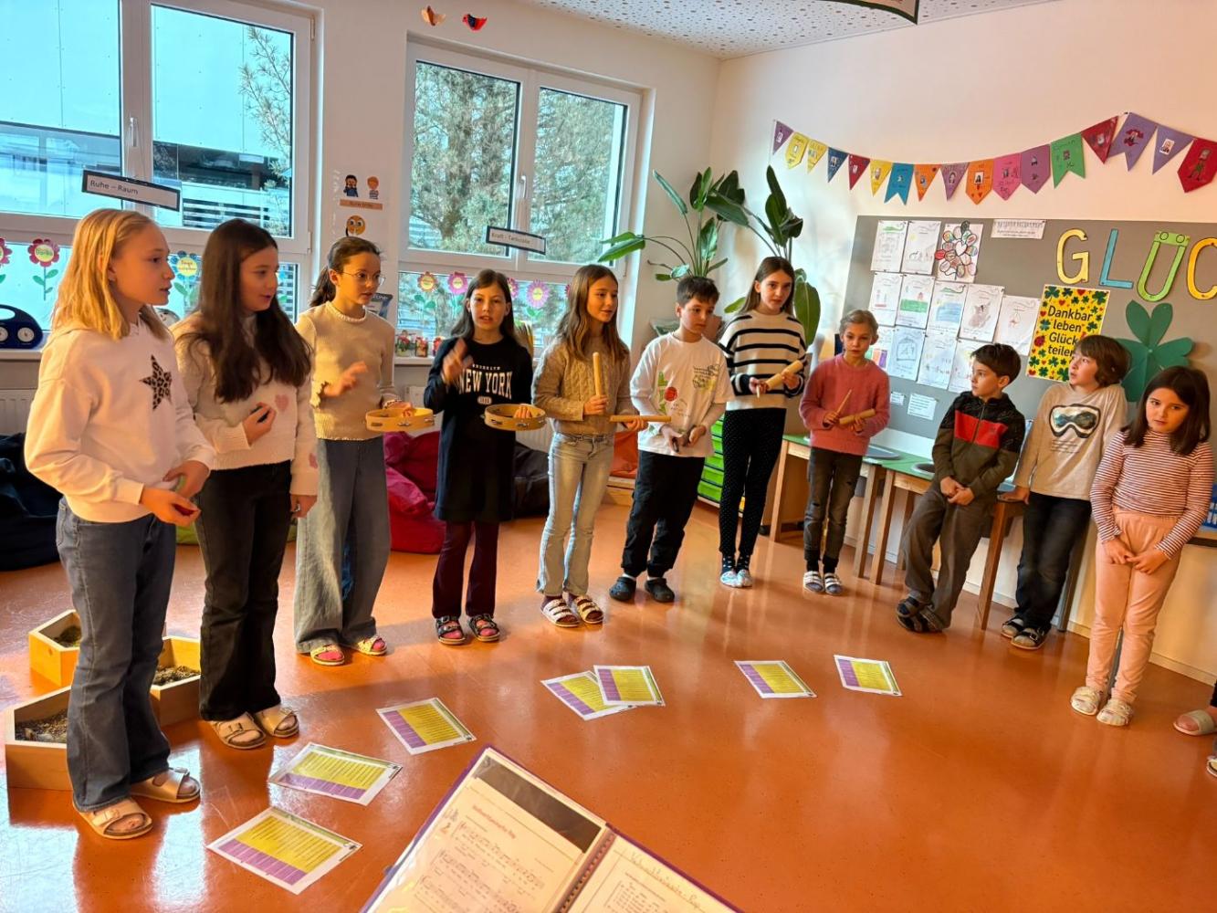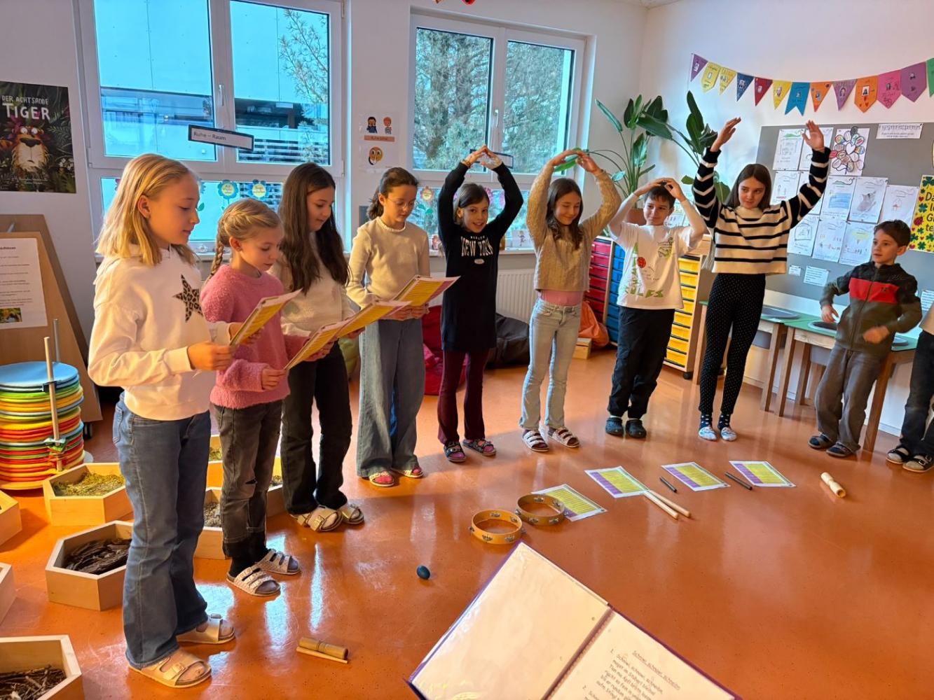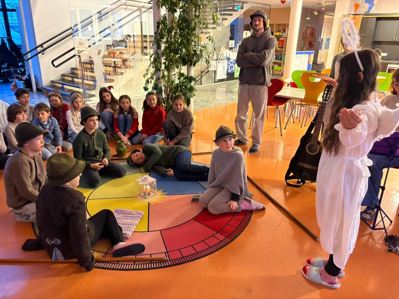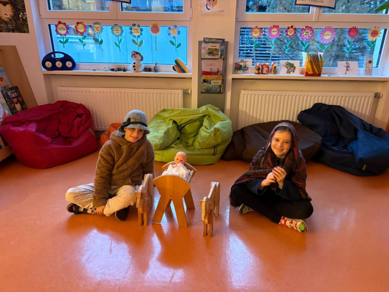 Jeden Montag kam eine andere Klasse dran und führte den MitschülerInnen und Lehrerinnen etwas vor. Nachdem die 1., 2. und 4. Schulstufe eine Nikolaus-Klanggeschichte, einen Weihnachtswünsche-Rap, Gedichte vorgetragen und Weihnachtslieder gesungen hatten, führte die 3. Schulstufe noch ein Krippenspiel vor.